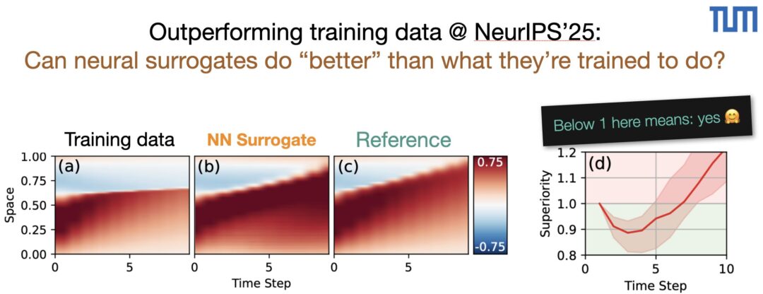 Can AI surrogates outperform their training data? Turns out the answer is yes – with a few caveats 😉 https://tum-pbs.github.io/emulator-superiority/ This post higlights Felix’ NeurIPS paper to be presented next week in San Diego. He discovered this “superiority”, and developed a theory to analyze when it does show up. This surprising behavior leads to interesting and fundamental questions about the role of training data, and about how neural networks and learning-based surrogates should be evaluated.